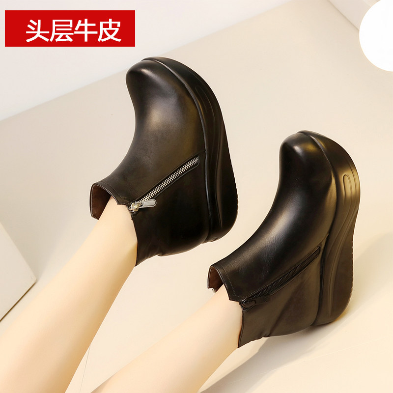 特价真皮短靴女坡跟厚底软底松糕圆头牛皮靴加绒保暖中老年妈妈靴