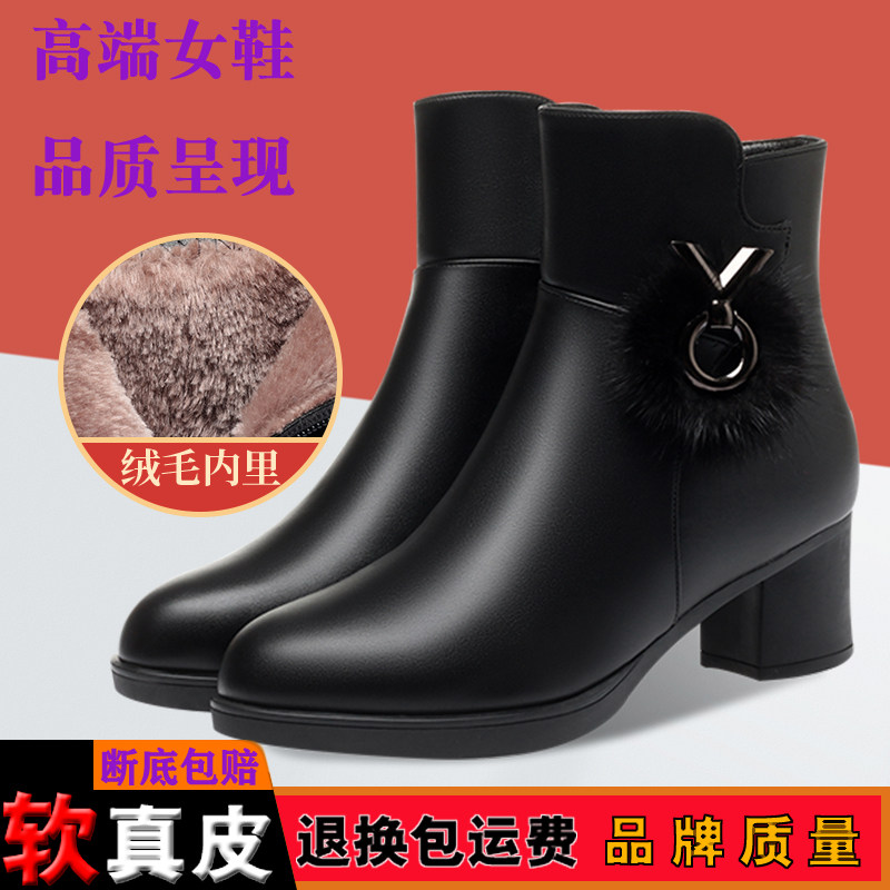 粗跟短靴女真皮2022年冬季中跟马丁靴加绒加厚皮靴中老年妈妈靴子