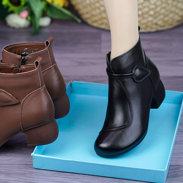 妈妈棉鞋真皮软底短靴单靴女士棉皮鞋中年中跟靴子中老年女鞋棉靴