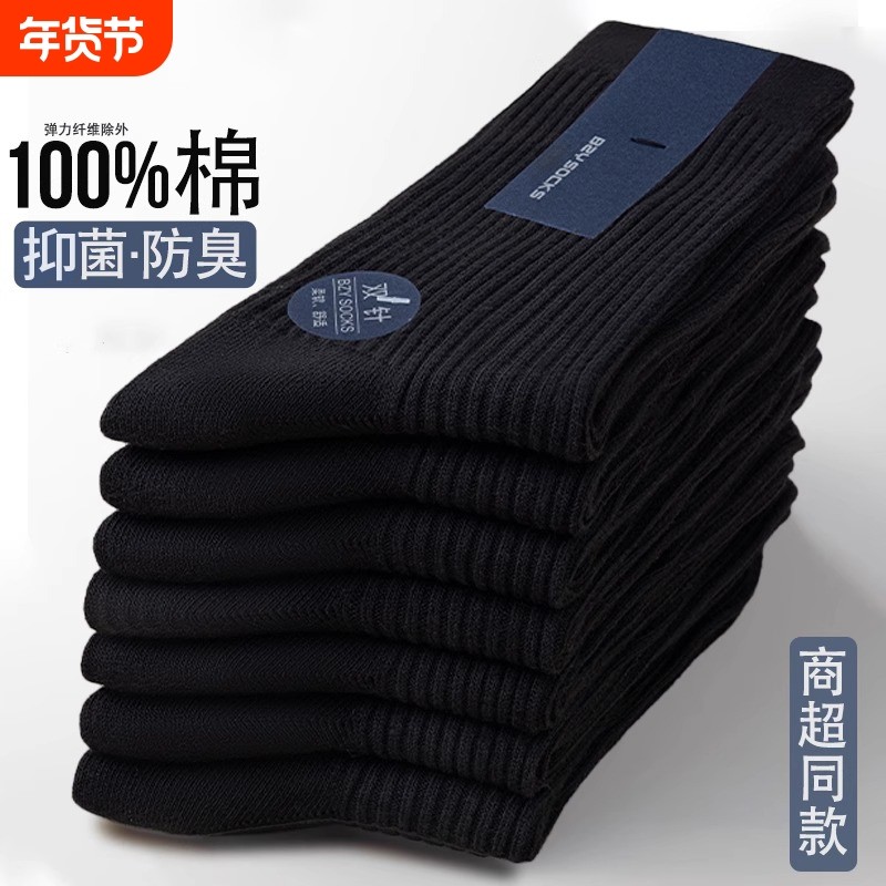 纯棉袜子男士秋冬季加厚中筒袜7A抗菌防臭吸汗运动黑色春天款长袜