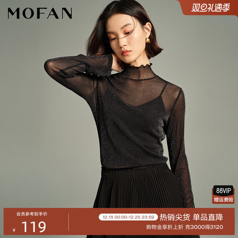 轻透黑色高领打底衫女MOFAN摩凡2025冬新款长袖内搭透视网纱上衣