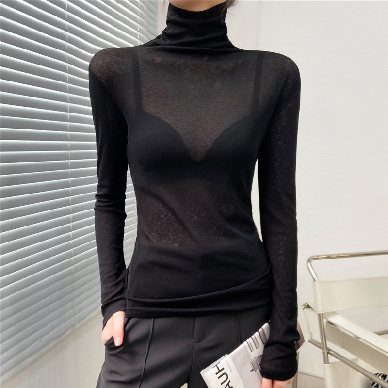 黑色高领打底衫女秋冬内搭微透性感面膜冰丝透视网纱上衣高级感薄