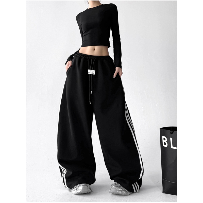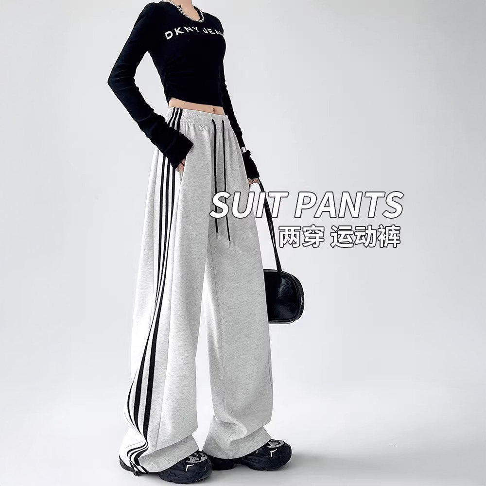 进口2025春夏美式三杠运动裤女高腰显瘦阔腿直筒休闲时尚卫裤窄