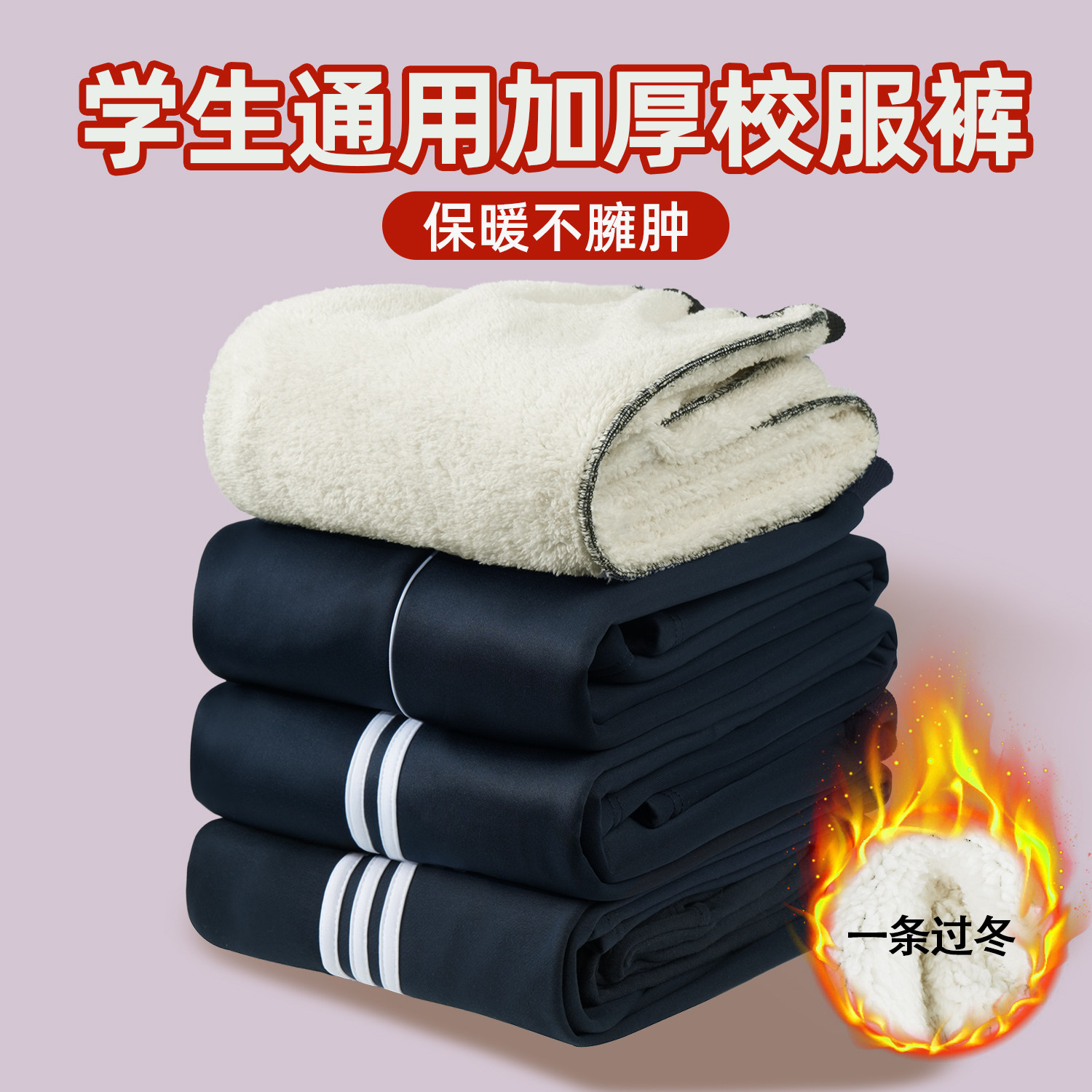 宝蓝色加厚羊羔绒冬季校服裤子蓝色两道杠直筒宽松保暖裤三道杠裤