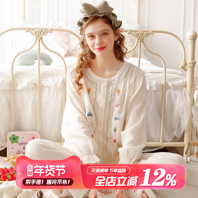 双层纱布月子服纯棉孕妇冬季喂奶睡衣产妇哺乳全棉A类家居服套装