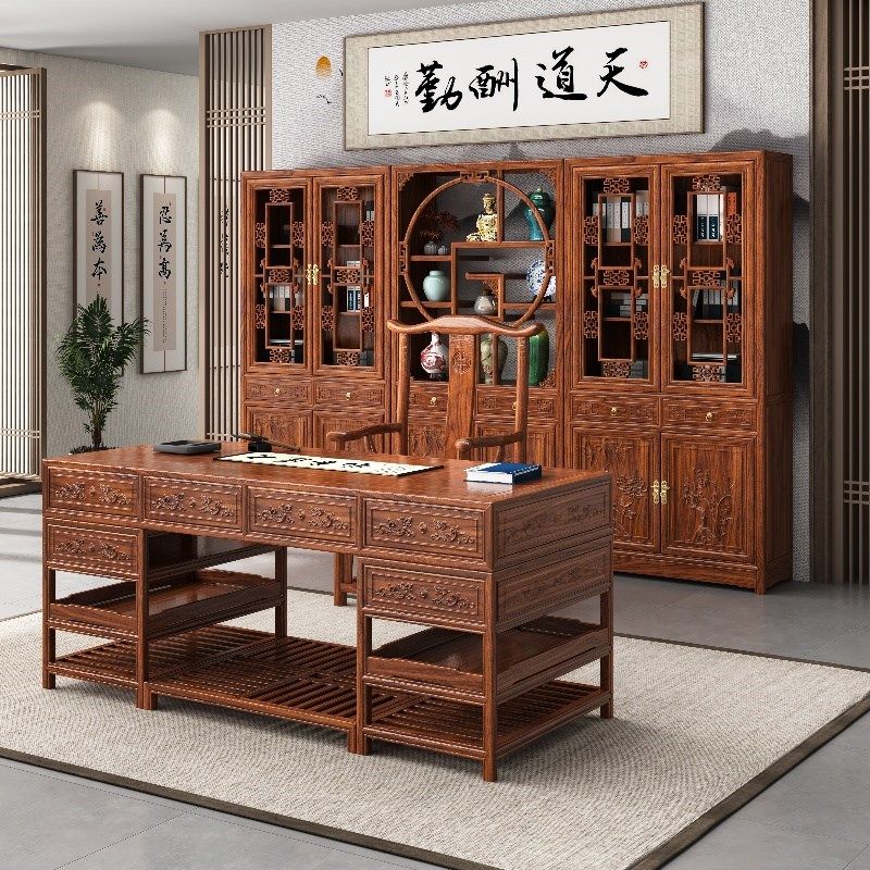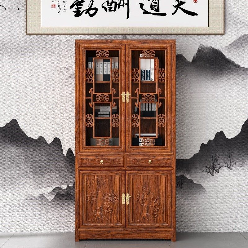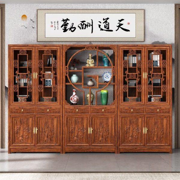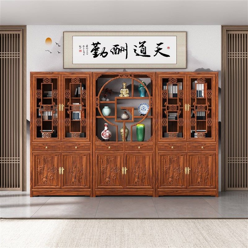 中式实木带门书柜书架新款三组合榆木展示柜玻璃书房办公室用仿古