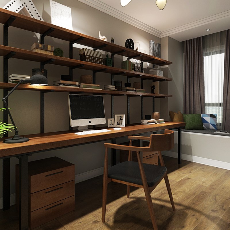 loft美式实木电脑桌子书房书桌带书架组合桌卧室电脑台式桌子家用