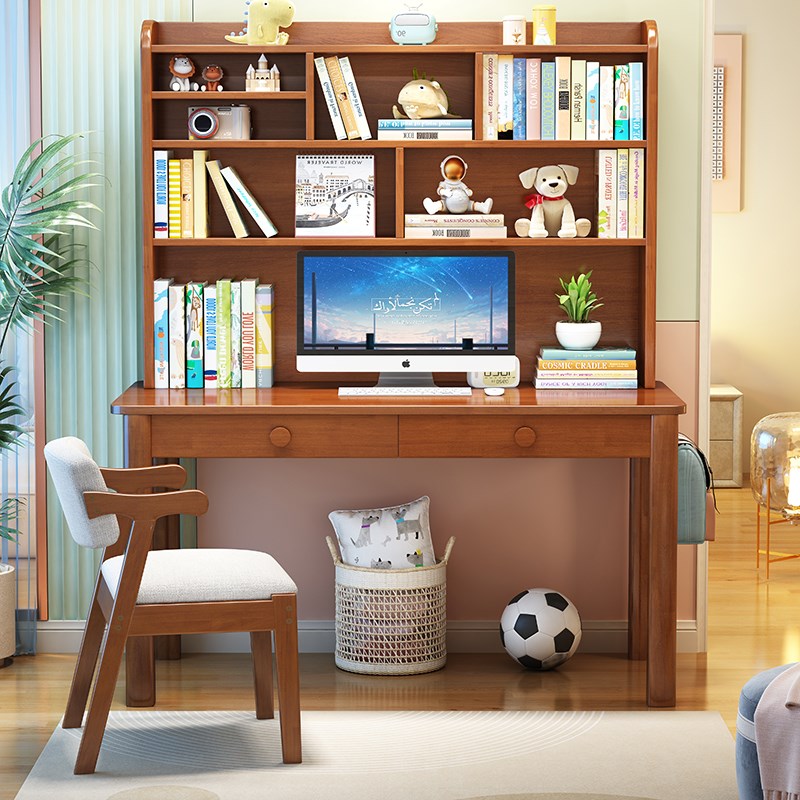 实木书桌带书架组合写字桌卧室简约台式电脑桌中小学生儿童学习桌