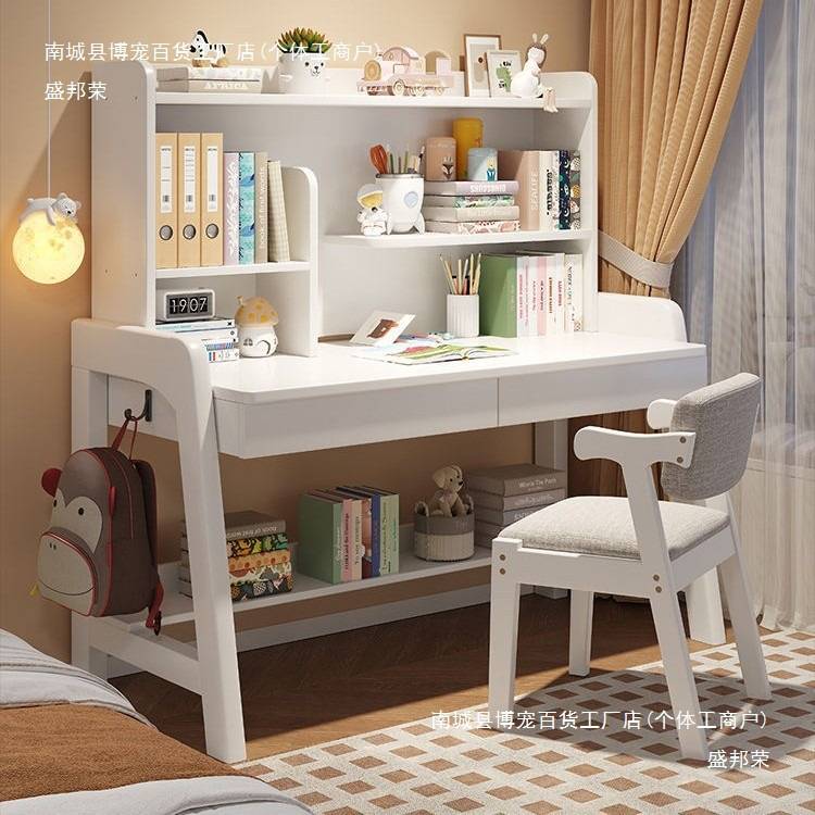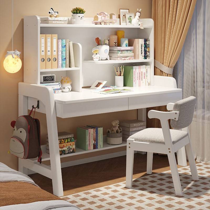 中小学生书桌带书架组合家用写字桌可升降卧室实木学习桌白色书桌