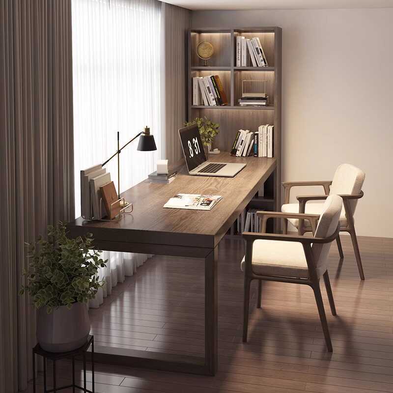 实木书桌带书架组合双人学习桌卧室办公电脑台式桌家用书柜一体桌