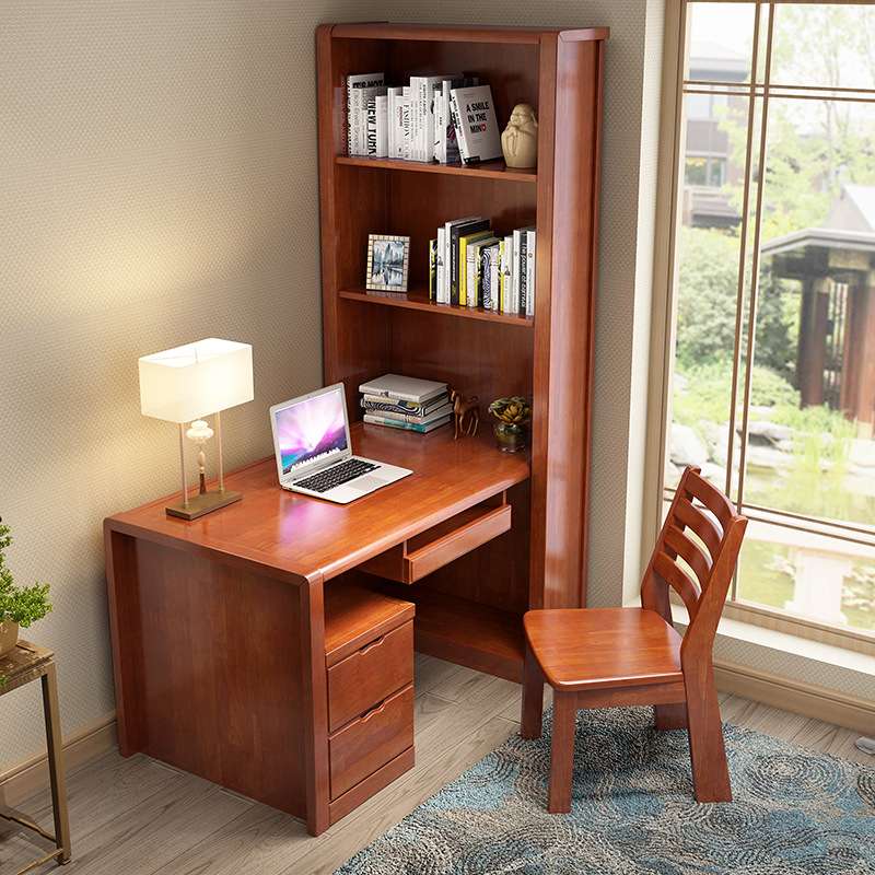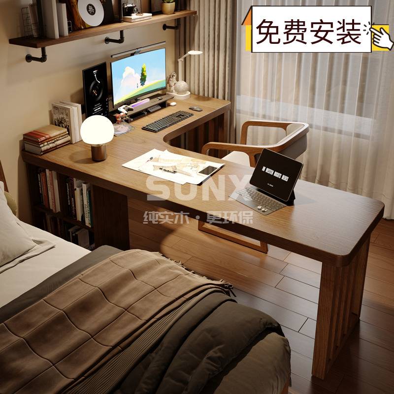 实木书桌带书架组合一体书柜卧室家用转角电脑台式桌写字桌办公桌