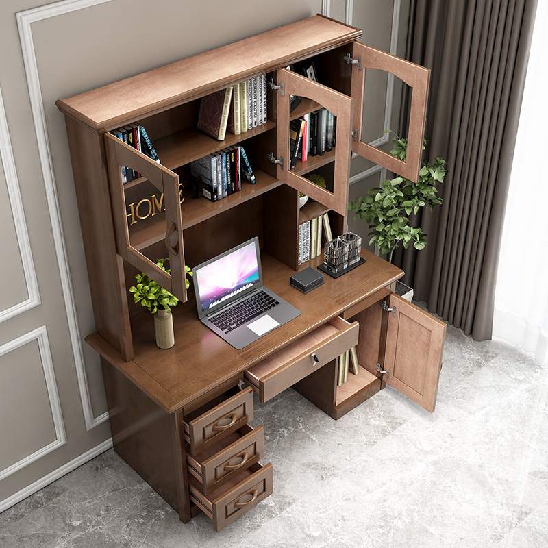 中古风实木转角书桌书柜书架一体组合带玻璃家用卧室学生学习桌子