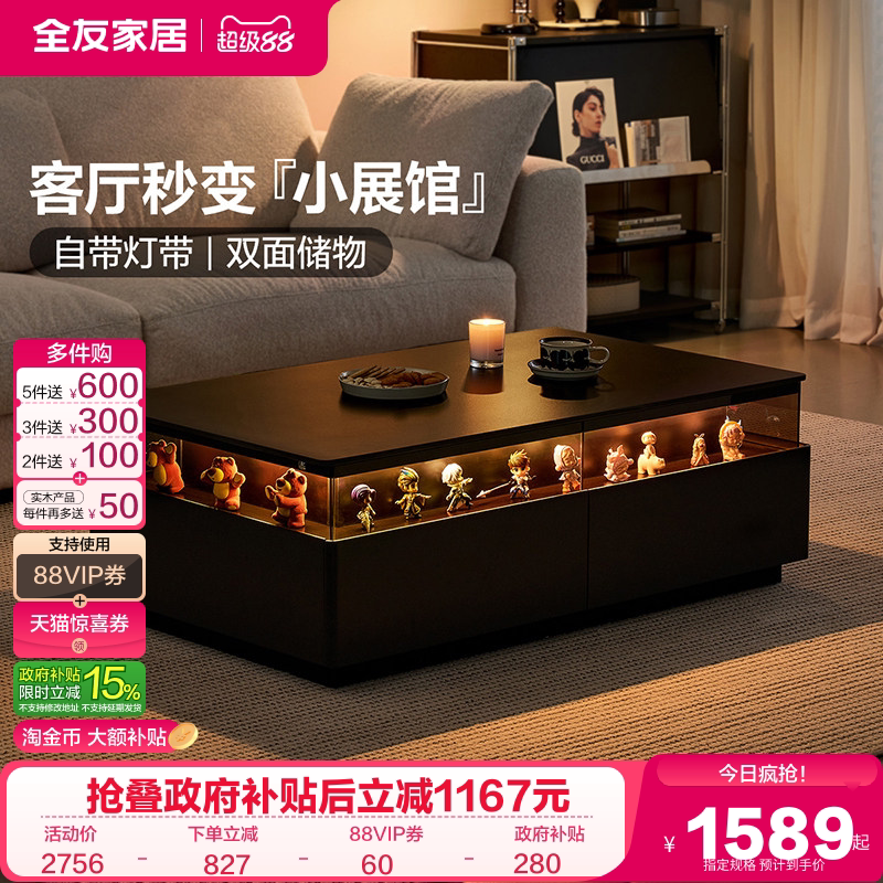 全友家居复古风岩板茶几客厅家用轻奢高级感带灯展示柜2026新款