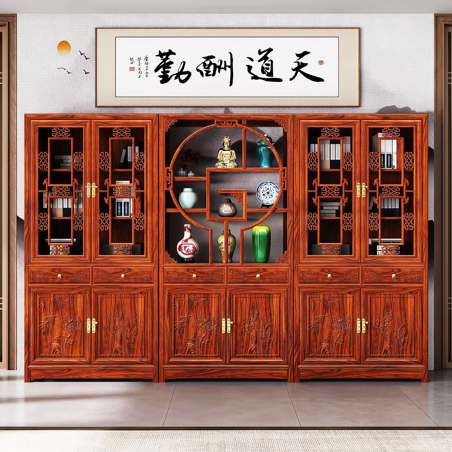 中式实木带门书柜书架新款三组合榆木展示柜玻璃书房办公室用仿古