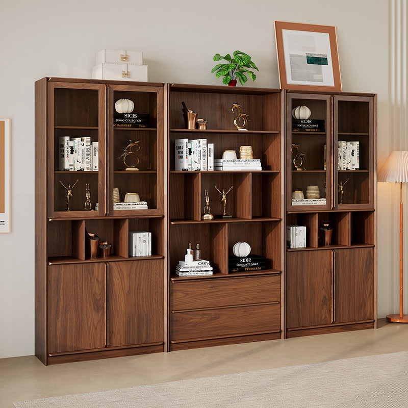 实木书柜北美黑胡桃木带门书柜落地一体靠墙防尘书柜原木全屋定制