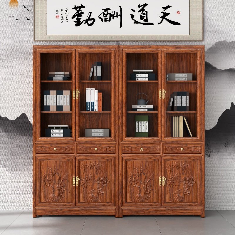 新中式书柜置物架全实木落地书架书橱轻奢带门书柜书台组合储物柜