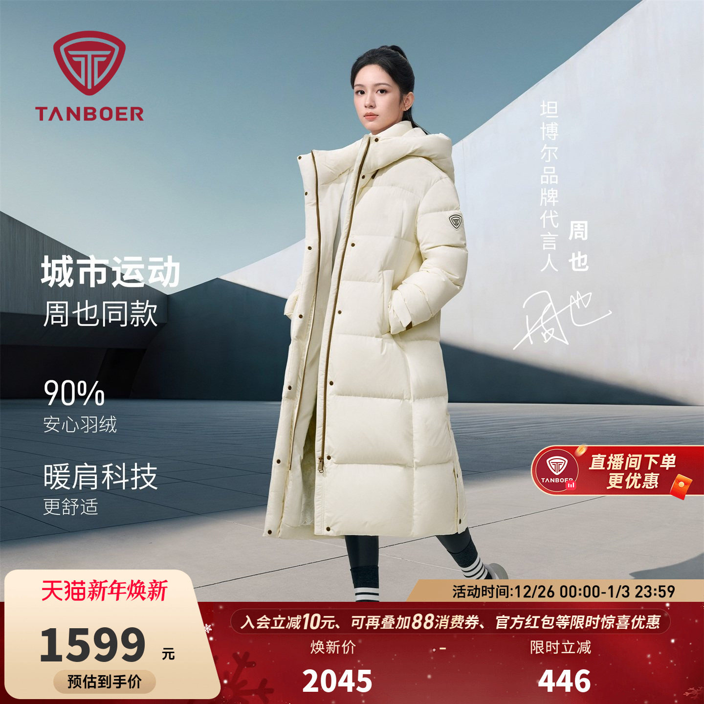 【周也明星同款】坦博尔25冬季新款羽绒服女长款过膝连帽加厚外套