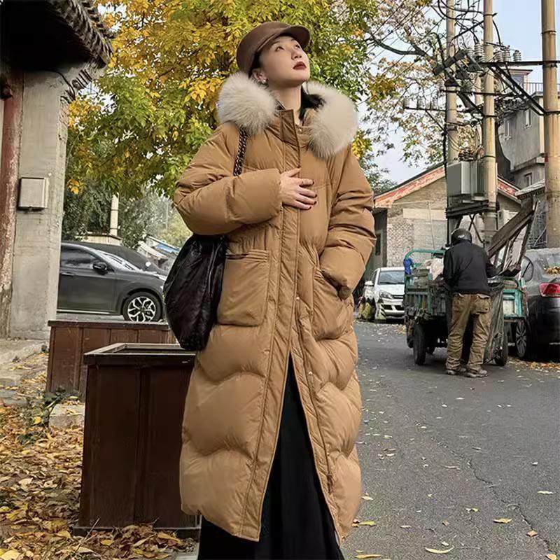 90白鸭绒2025冬季新款羽绒服女长款过膝加厚连帽时尚宽松大码外套