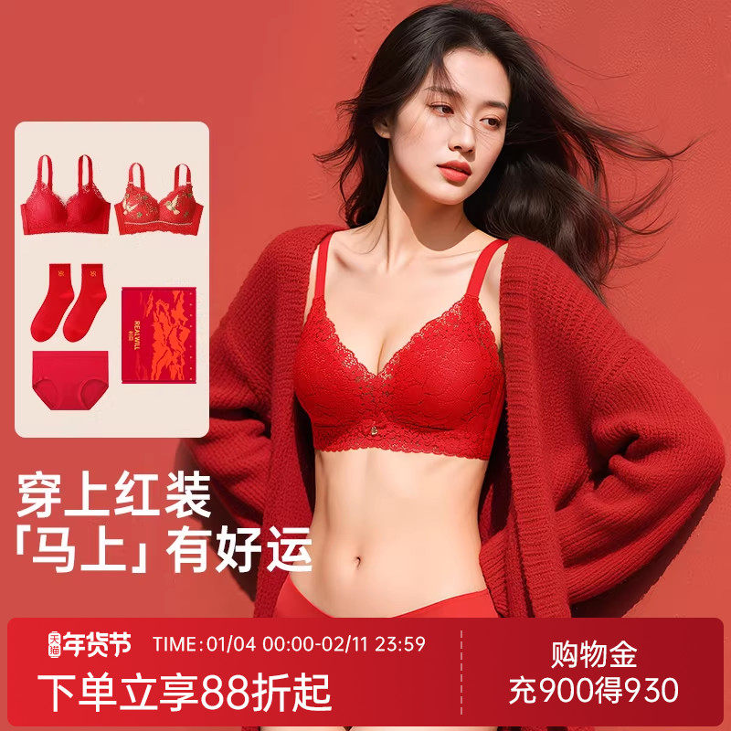 润微红色内衣女小胸聚拢显大本命年内衣马年无钢圈文胸罩结婚文胸