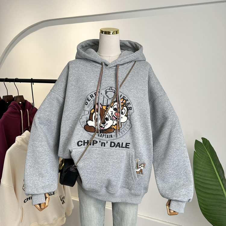 2023冬新款韩版宽松百搭前后刺绣松鼠加绒加厚连帽套头长袖卫衣女