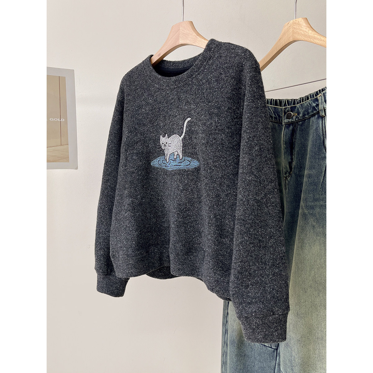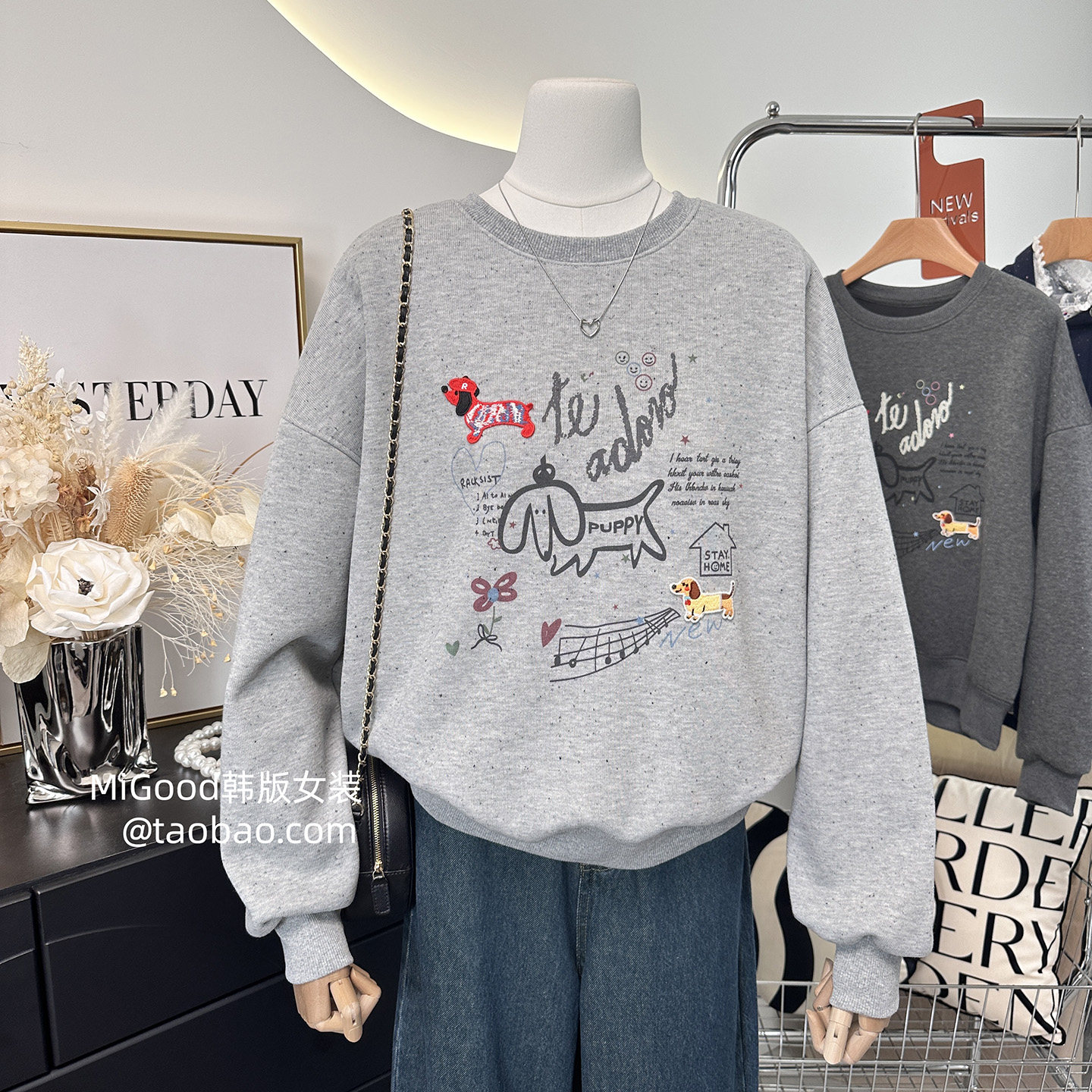 冬季2025新款韩系时尚洋气刺绣小狗宽松大码圆领加绒卫衣女套头衫