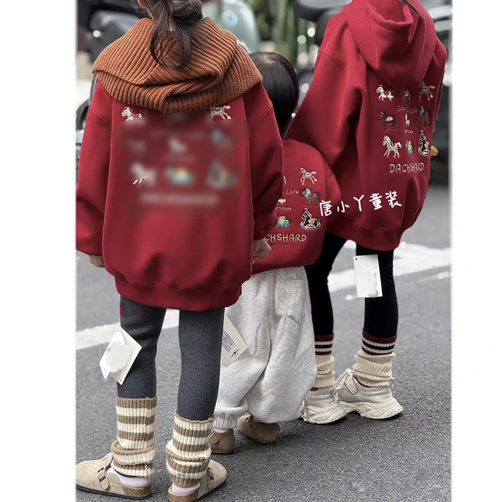 亲子红色加绒卫衣刺绣小马马年本命年韩版宽松奥粒绒套头衫男女童