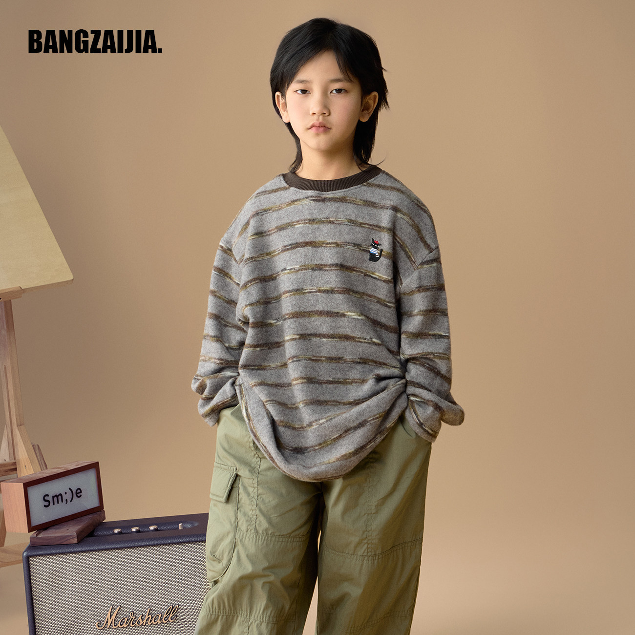 冬季新款童装韩版条纹猫咪刺绣宽松卫衣男女童套头圆领上衣打底衫