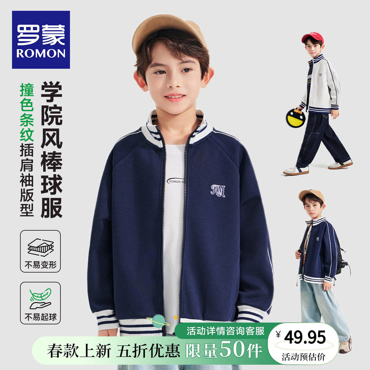 罗蒙男童外套2026新款春夏秋儿童夹克立领开衫学院风棒球服早春装