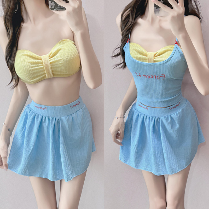 性感辣妹三件套比基尼套装钢托小胸聚拢半裙泳衣遮肉泳装bikini