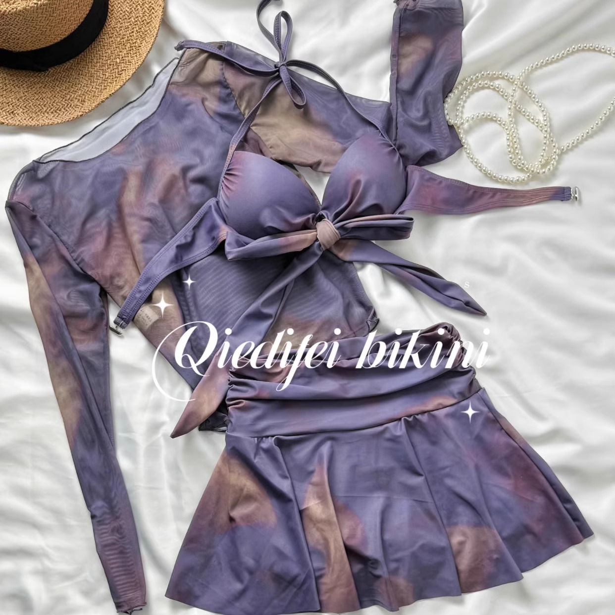 《浪漫紫》bikini裙式分体三件套小胸聚拢度假ins高级泡温泉泳衣