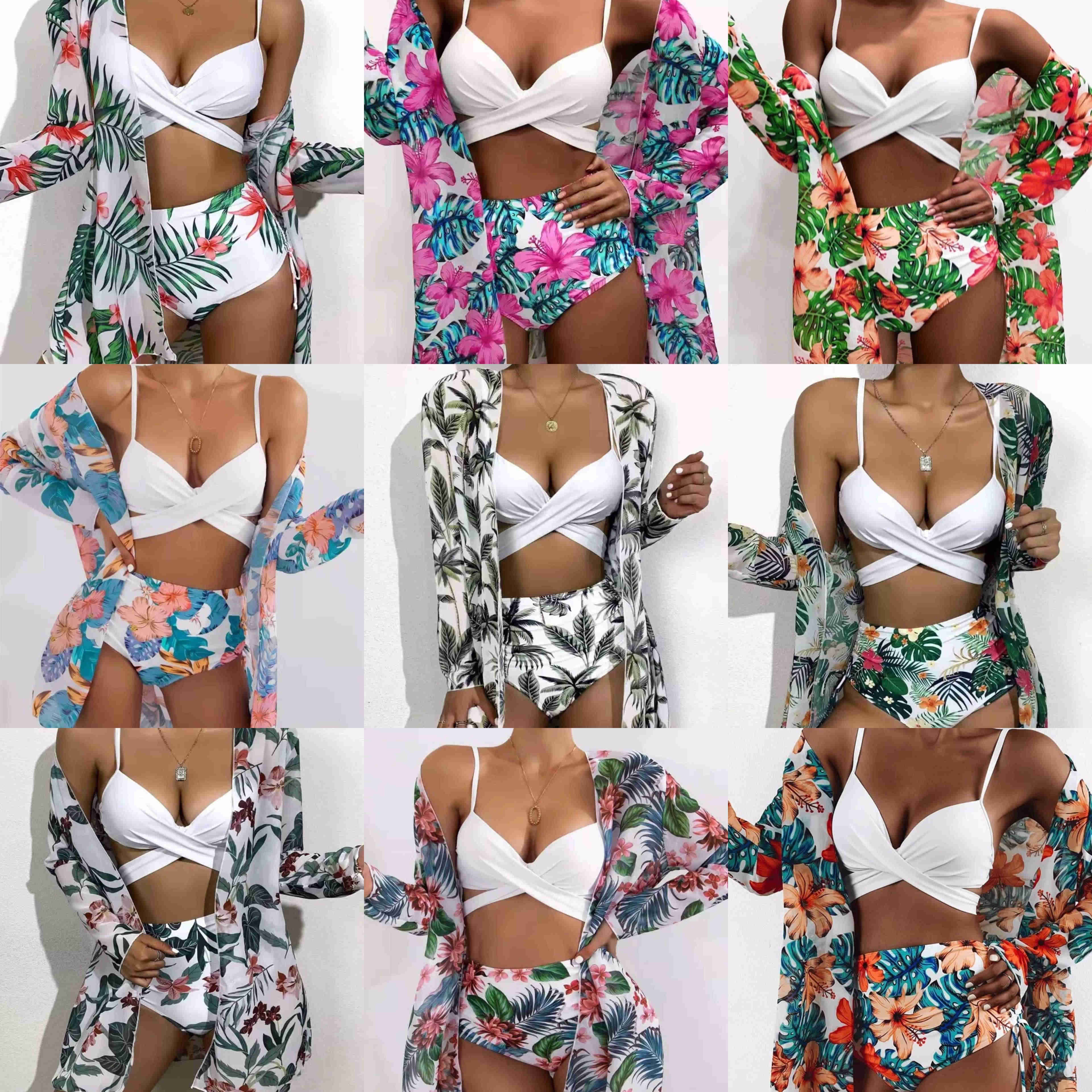 欧美外贸聚拢比基尼三件套性感高腰bikini分体泳衣套装雪纺长裙款