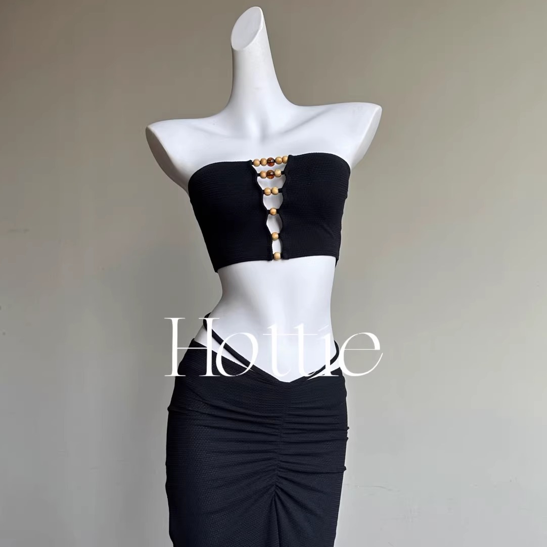 新中式串珠抹胸bikini三件套性感辣妹聚拢显瘦沙滩温泉度假泳衣女