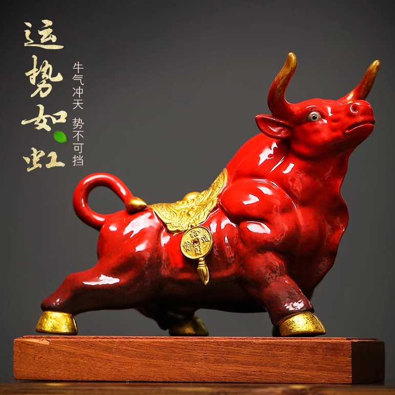 陶瓷红色牛小摆件牛气冲天家居招财装饰品办公室吉祥物生肖牛礼品