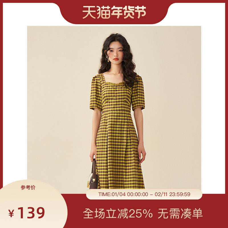 PIT复古法式设计感纯棉格子连衣裙女2025秋季新款方领泡泡袖裙子