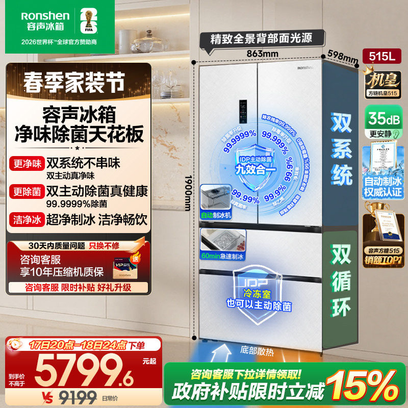 容声方糖515L主动双净双系统法式多门家用一级变频超薄嵌入式冰箱