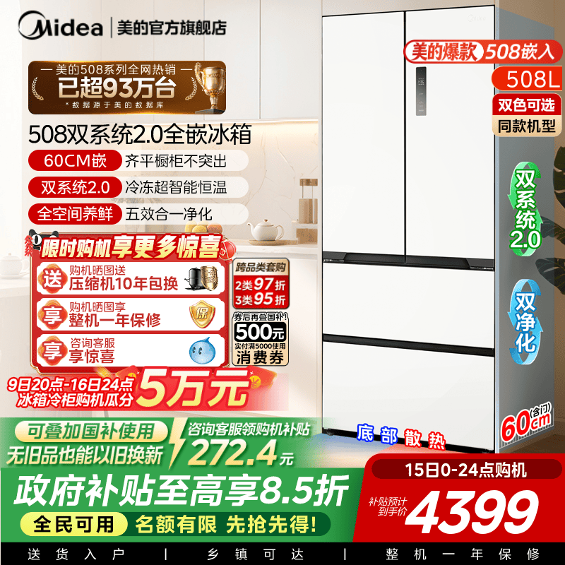 【508嵌入】美的双系统2.0超薄零嵌入式冰箱法式双开多门四门家用