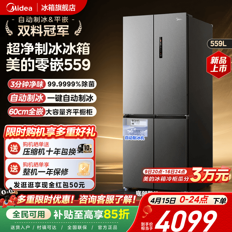新品美的559超薄零嵌入式冰箱家用十字多门对开全自动制冰大容量