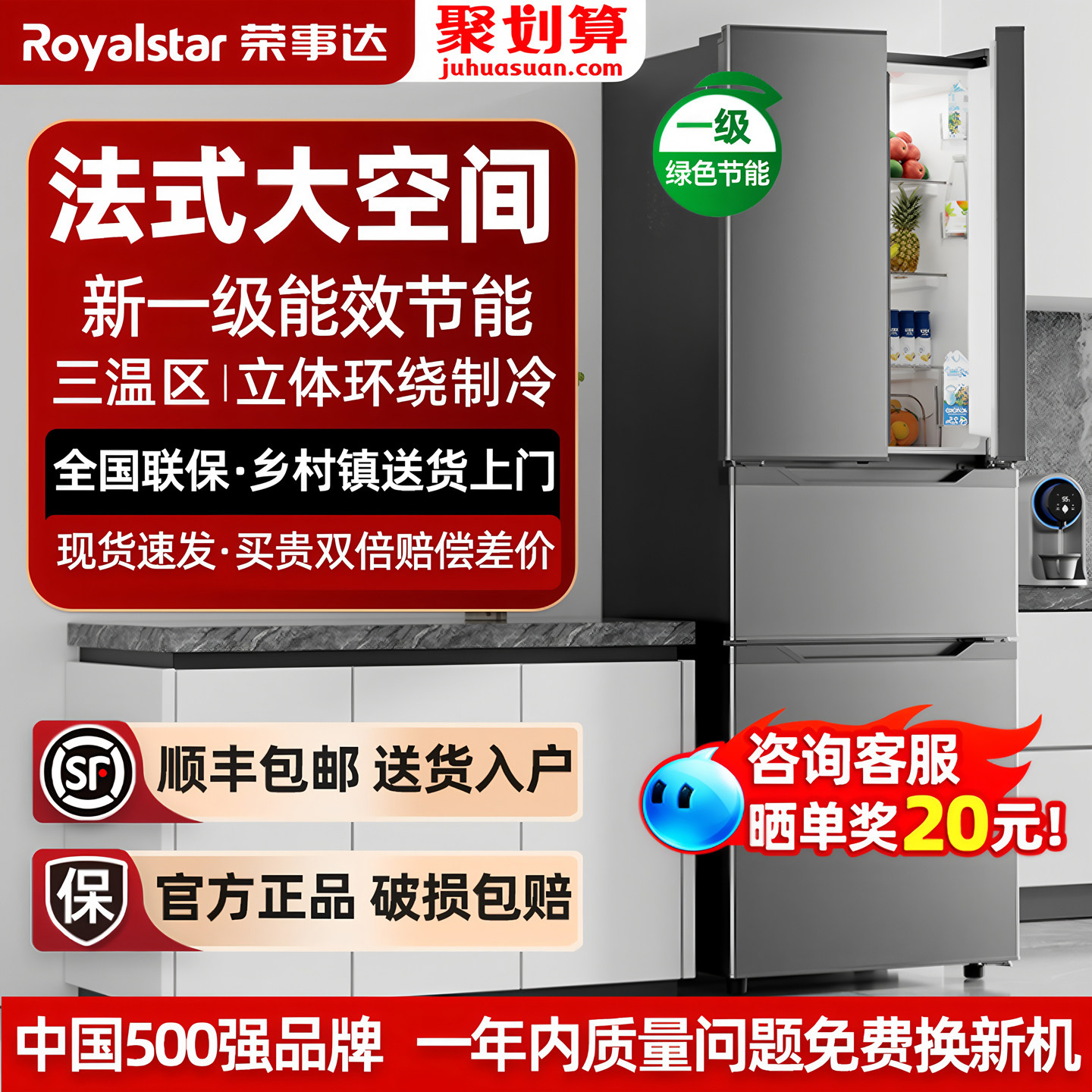 荣事达301L法式电冰箱家用一级能效超薄嵌入式多门节能大容量风冷