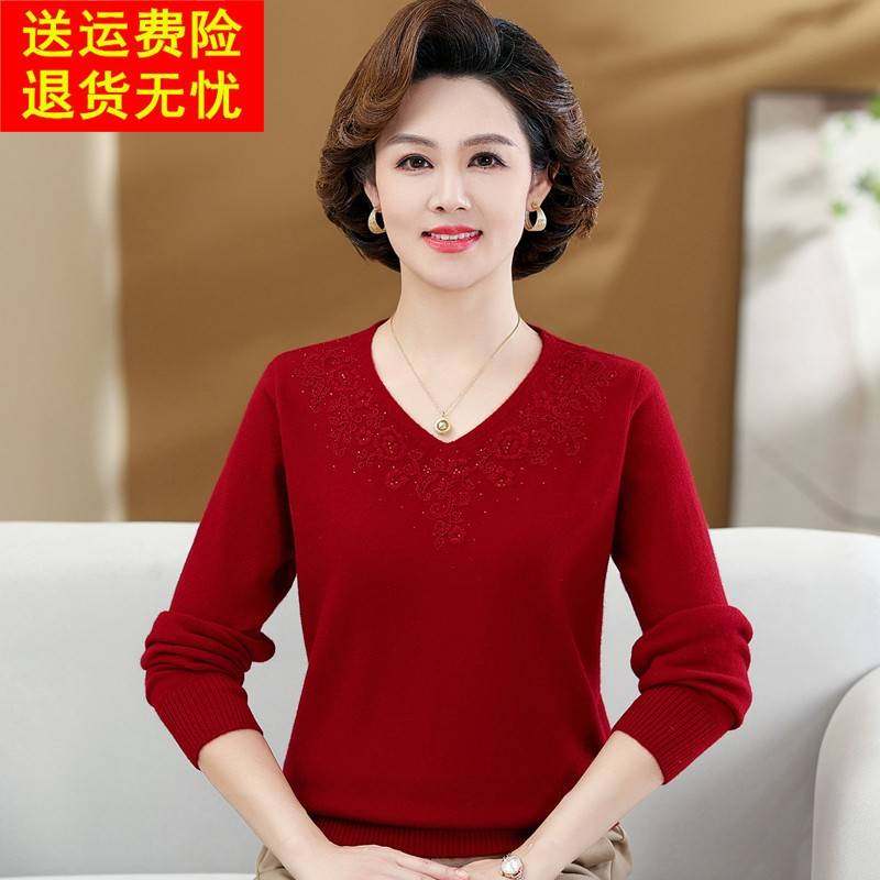 洋气妈妈秋冬新款羊毛衫女中老年宽松大码V领羊绒打底衫加厚毛衣