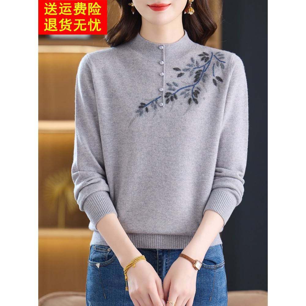 100纯羊毛衫女中老年妈妈装半高领绣花毛衣大码秋冬装羊绒打底衫