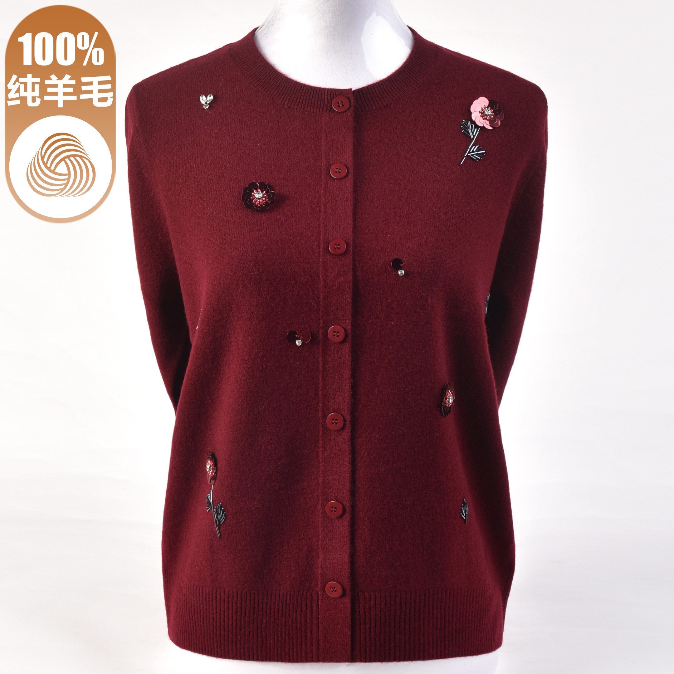 100%纯羊毛针织衫外套女中老年秋冬圆领毛衣开衫洋气妈妈春装上衣