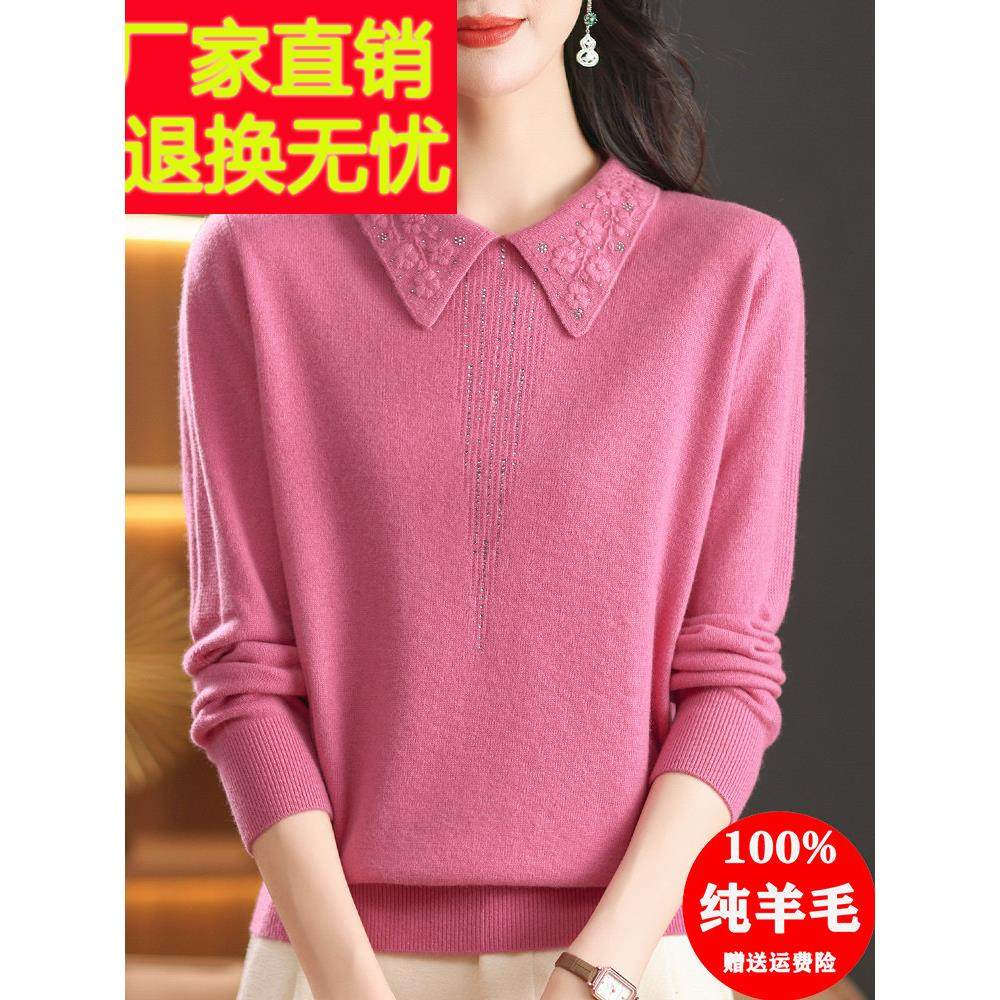 翻领毛衣女中老年妈妈100%羊毛衫气质宽松针织上衣显瘦秋冬打底衫