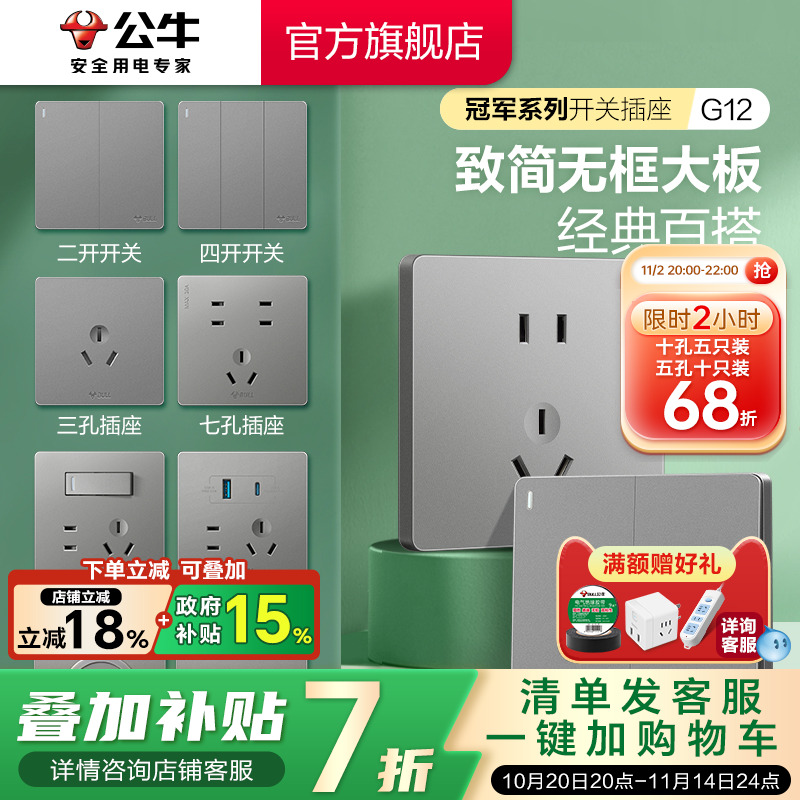 公牛开关插座面板官方旗舰店g12一开五孔多功能正品墙壁全屋套餐