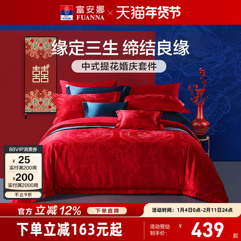 富安娜结婚四件套婚庆红色纯棉床上用品新婚礼物婚嫁喜被新婚被套