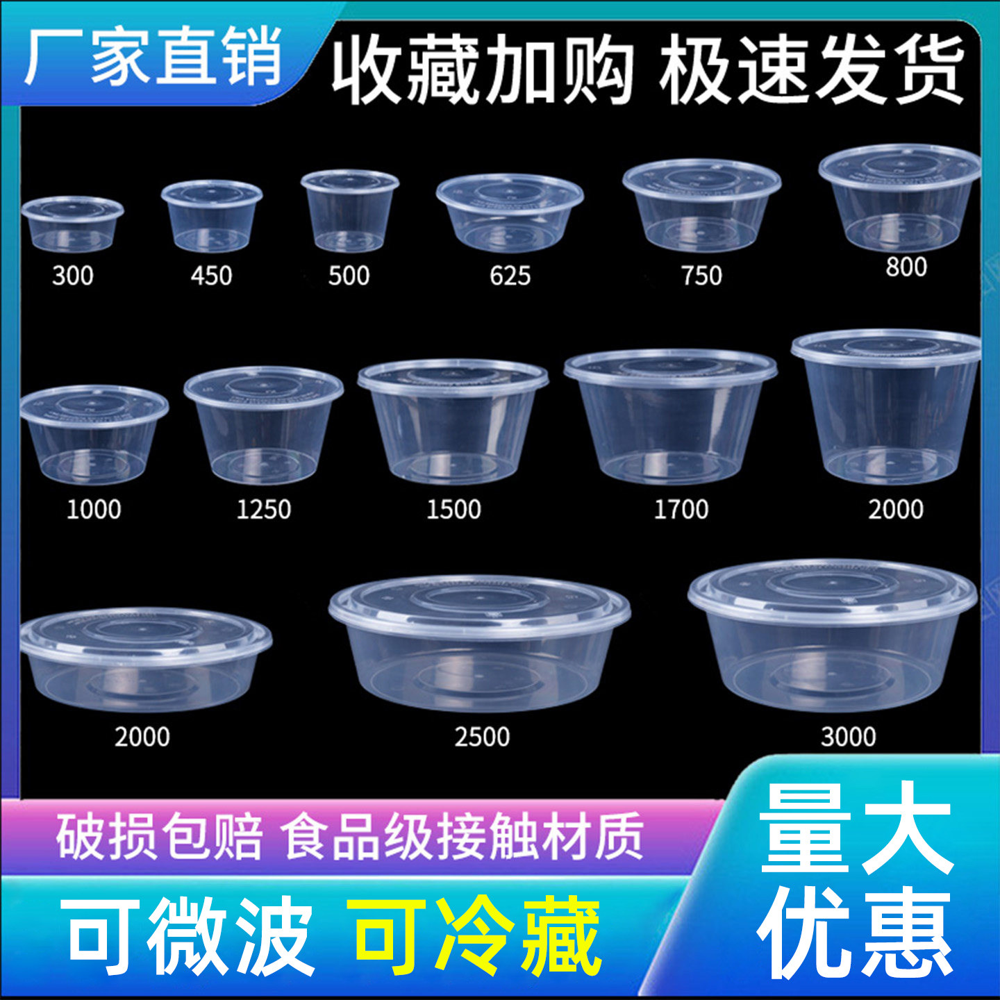 圆形1000一次性餐盒外卖打包饭盒快餐汤碗酱料便当塑料透明加厚