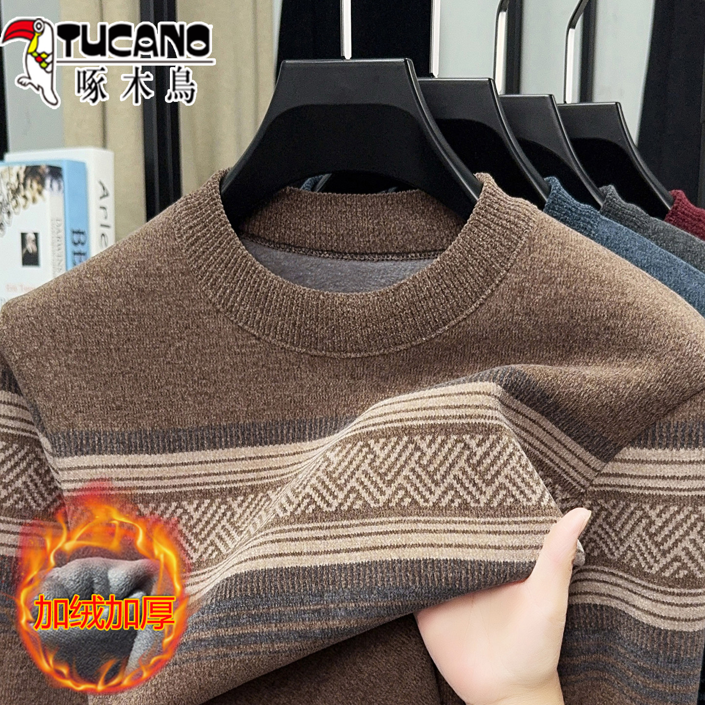 啄木鸟加绒加厚圆领羊毛衫男士冬季保暖毛衣休闲打底针织衫爸爸装