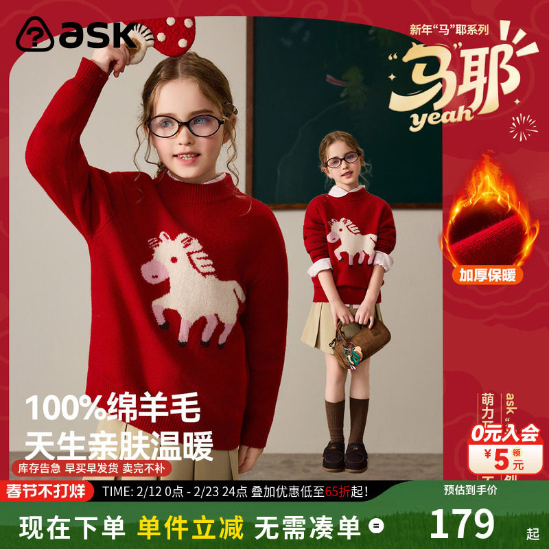 ask儿童红色毛衣2026年冬新款女童加厚保暖羊毛衫女孩圆领针织衫