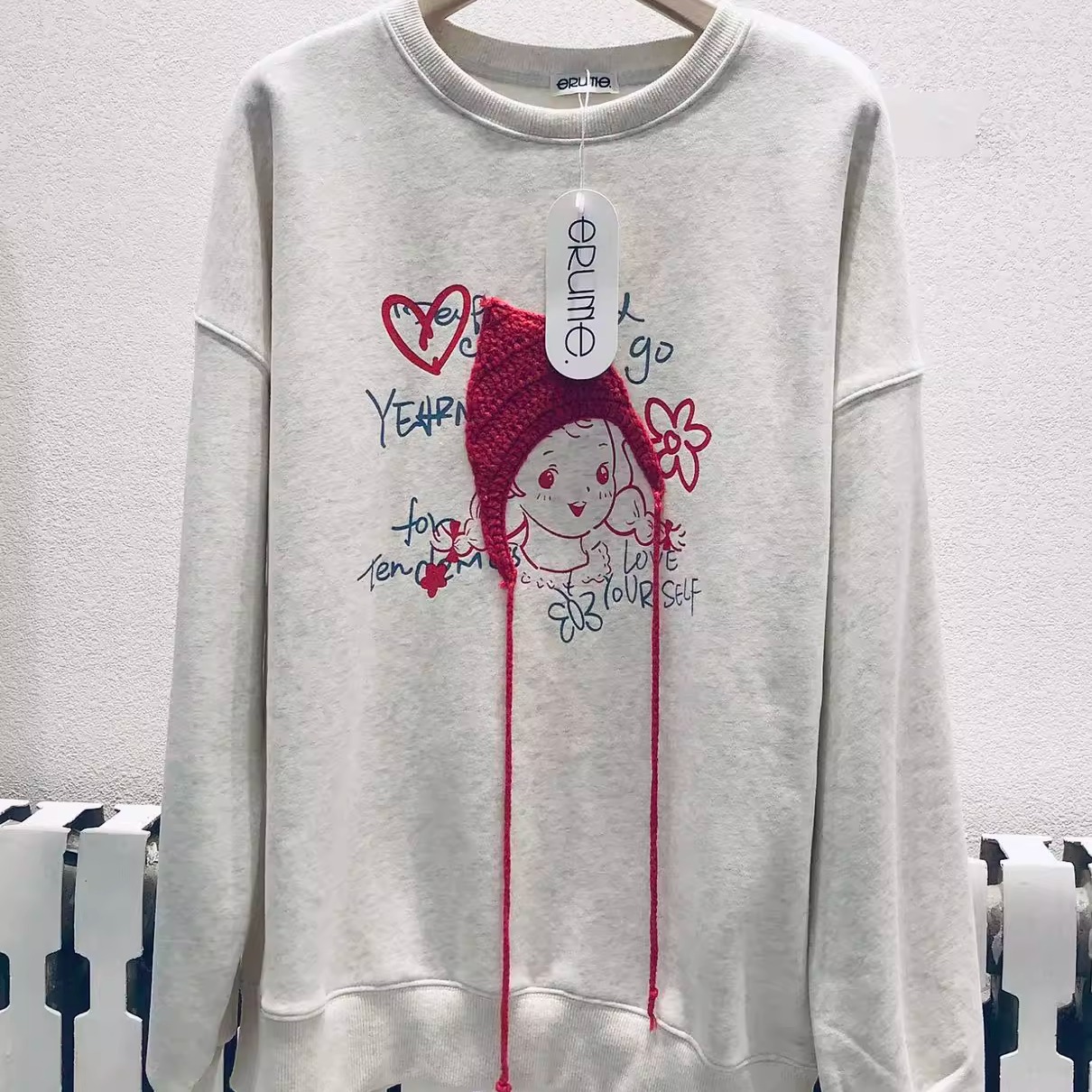 顽季果 韩里韩气穿搭慵懒风卡通印花卫衣宽松圆领百搭女外套上衣