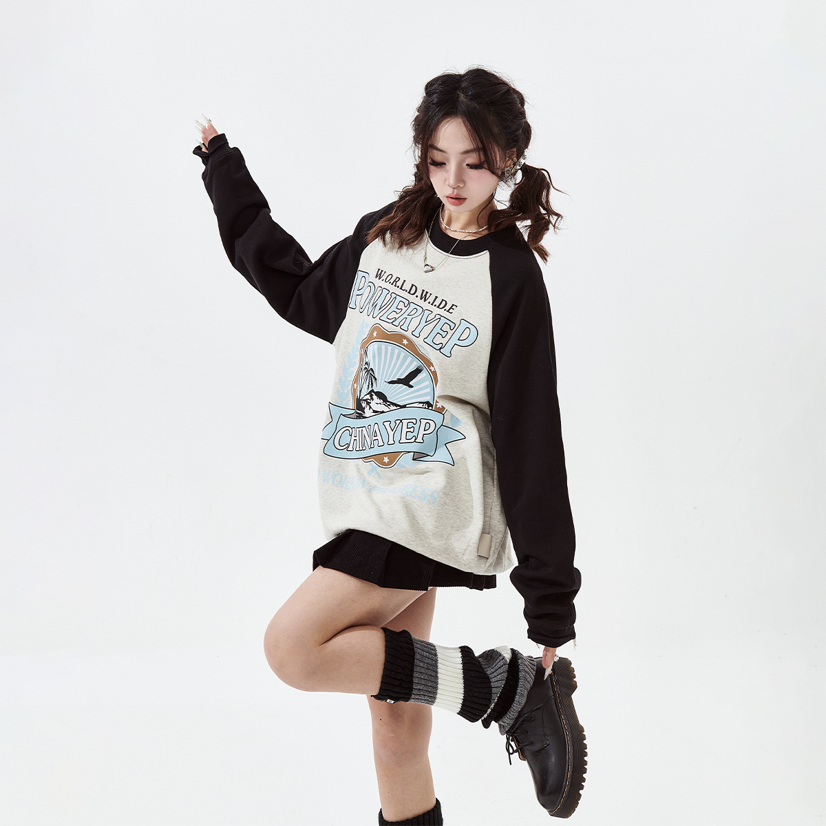 YEP拼接插肩袖卡通印花卫衣女春秋2025新款复古情侣宽松无帽上衣