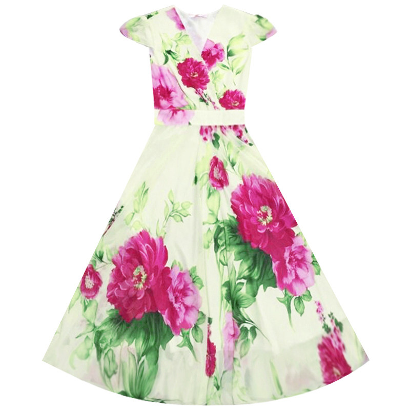 碎花雪纺连衣裙气质复古V领短袖大摆海边度假裙沙滩裙显瘦长裙子